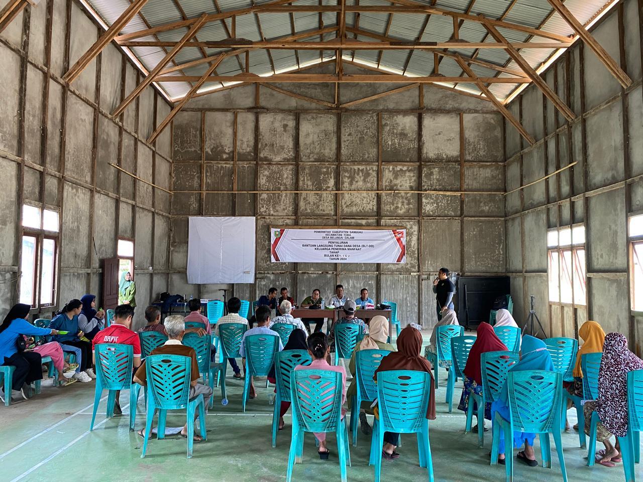 Penyaluran Bantuan Lansung Tunai Dana Desa Tahun anggaran 2024 Bulan ke 4, 5 dan 6 Desa Belungai Dalam dilaksanakan pada hari jumat, 14 Juni 2024 yang dilaksanakan di gedung pertemuan desa belungai dalam dengan jumlah KPM (Keluarga Penerima Manfaat) sebanyak 29 KPM dengan masing-masing menerima bantuan sebesar Rp. 900.000,00 /KPM. Pada kesempatan ini, dihadiri oleh kasi ekbang kecamatan toba bapak Yohanes Salasih beserta staf dan TPP Kecamatan Toba. terdapata 13 KPM yang disalurkan secara Door To Door dikarenakan KPM tersebut sudah tidak bisa pergi ke tempat penyaluran dikarenakan penyakit menua dan bawaan yang dialami oleh kpm dan terdapat 9 KMP yang tidak dapat ke Tempat penyaluran dikarenak akses jalan yang tidak bisa dilalui.